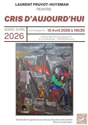 Une nouvelle exposition à découvrir au Centre Spirituel du Hautmont. Laurent PRUVOT-HUYSMAN nous fait l'honneur de partager certaines de ses oeuvres. Venez les découvrir dès à présent au Hautmont (Entrée libre et gratuite aux heures d'ouverture du Centre). Vernissage et visite de l'exposition en présence de l'artiste le vendredi 10 avril à 18h30.