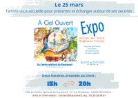 Lundi 25 mars, venez rencontrer Stéphanie TROCHON qui vous présentera son exposition "A CIEL OUVERT" actuellement au Centre spirituel du Hautmont. Deux visites au choix : à 15h ou à 20h. Nous vous attendons nombreux. Visite gratuite.