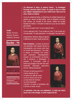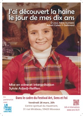 - le spectacle J'ai découvert la haine le jour de mes dix ans, d'après le texte Albert Cohen « Ô vous, frères humains » Mise en scène et interprétation : Sylvie Adjedj-Reiffers, le vendredi 28 mars à 20h. Accueil à partir de 18h30
